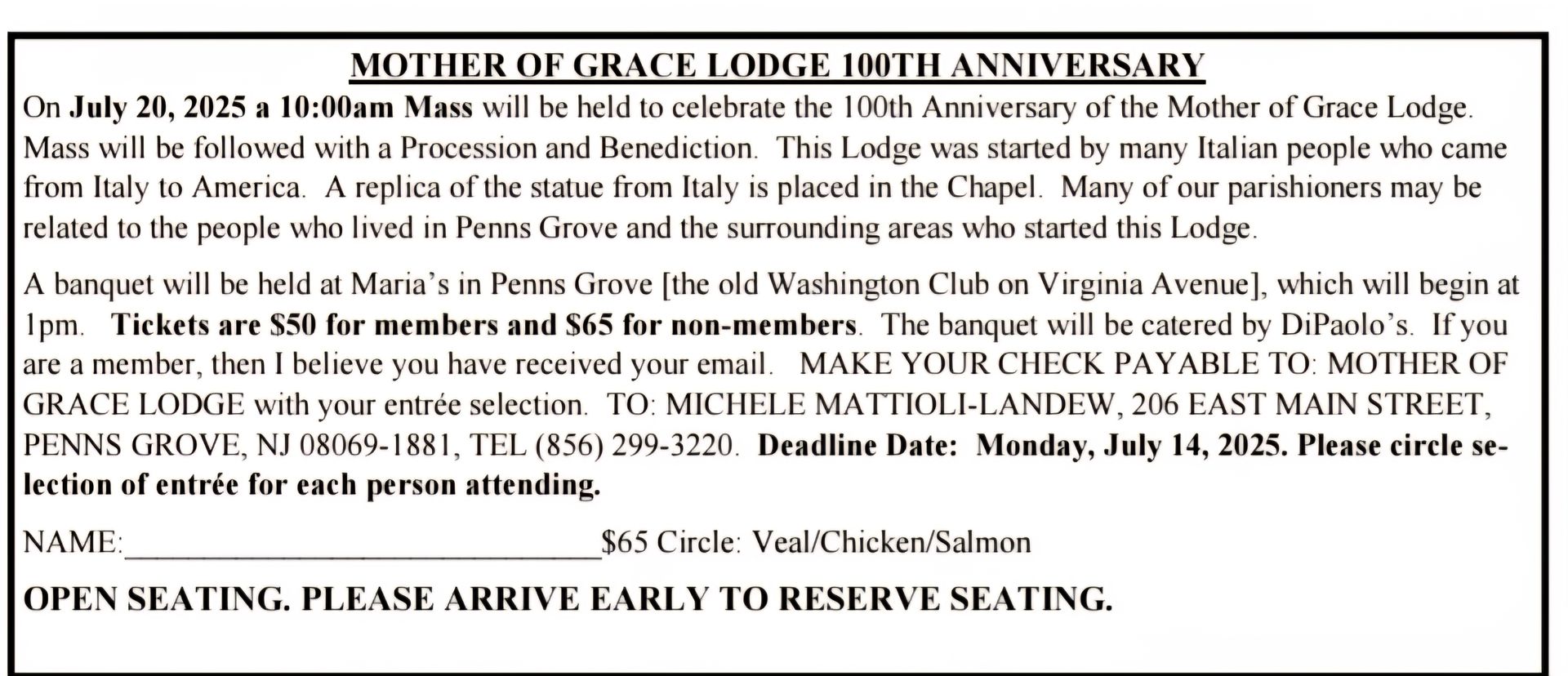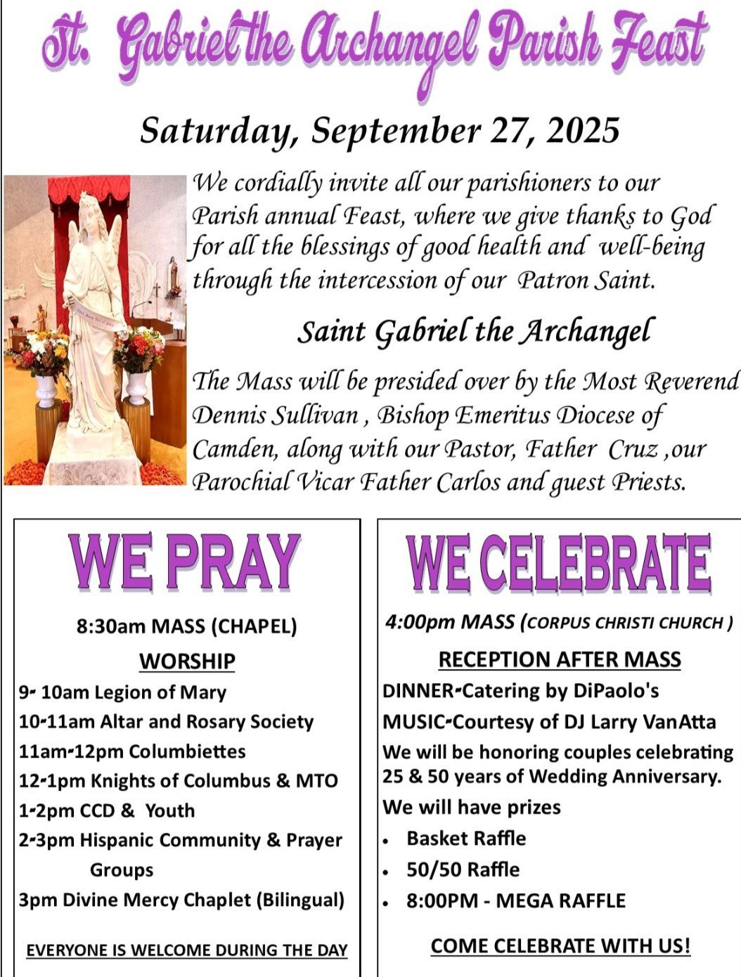 Sept 21st Parish Chicken Barbeque from 1pm to 4pm at VFW 253 in Salem. Pickup is also available in the Church Hall at Corpus Christi worship site in Carneys Point. Tickets go on sale Labor Day Weekend.