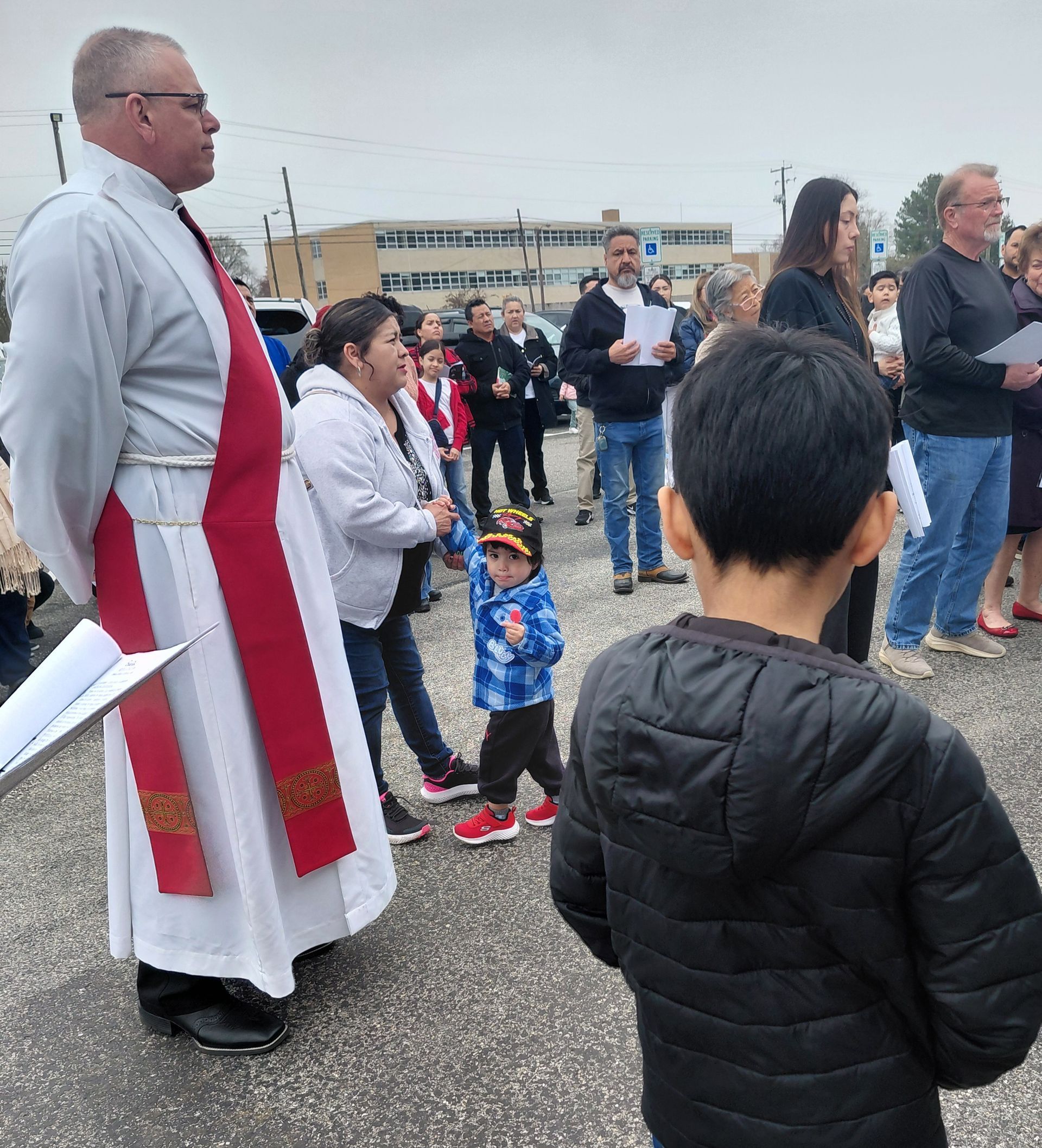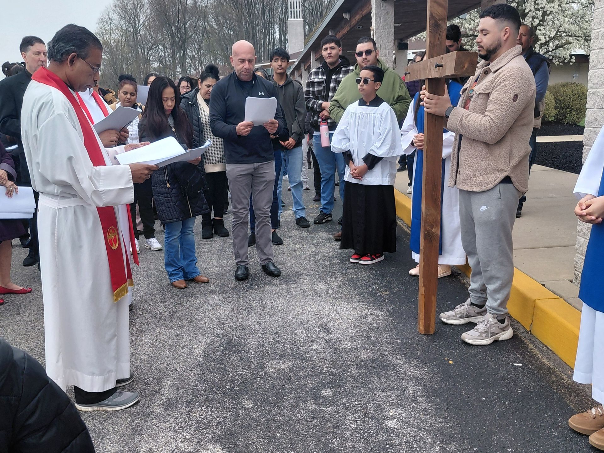 The faithful of St Gabriel Parish pray the Stations of the Cross outside on Good Friday 2026